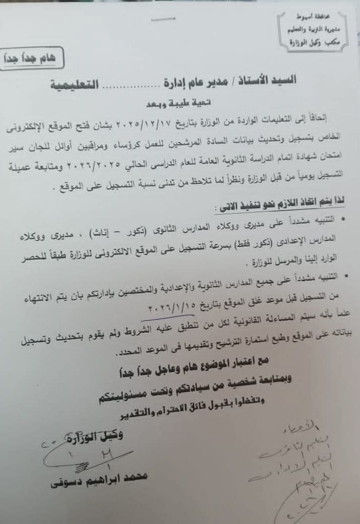 - التنبيه مشددًا على جميع المدارس الثانوية والإعدادية بأن يتم الانتهاء من التسجيل قبل موعد غلق الموقع بتاريخ ٢٠٢٦/١/١٥