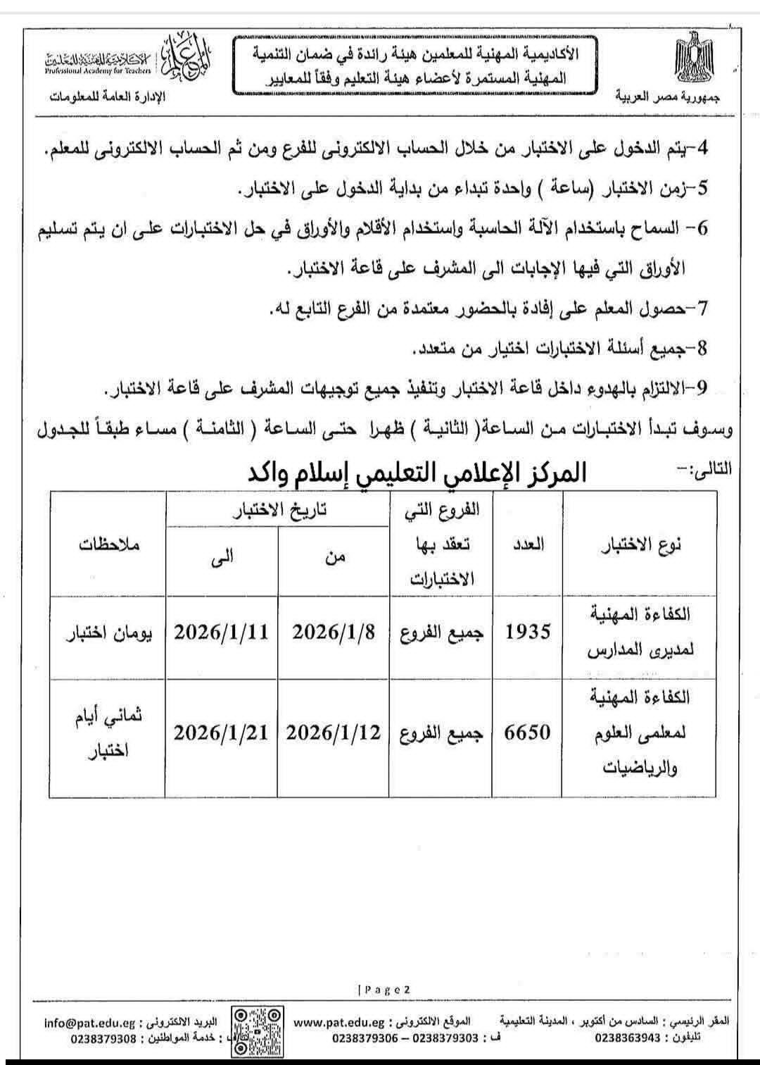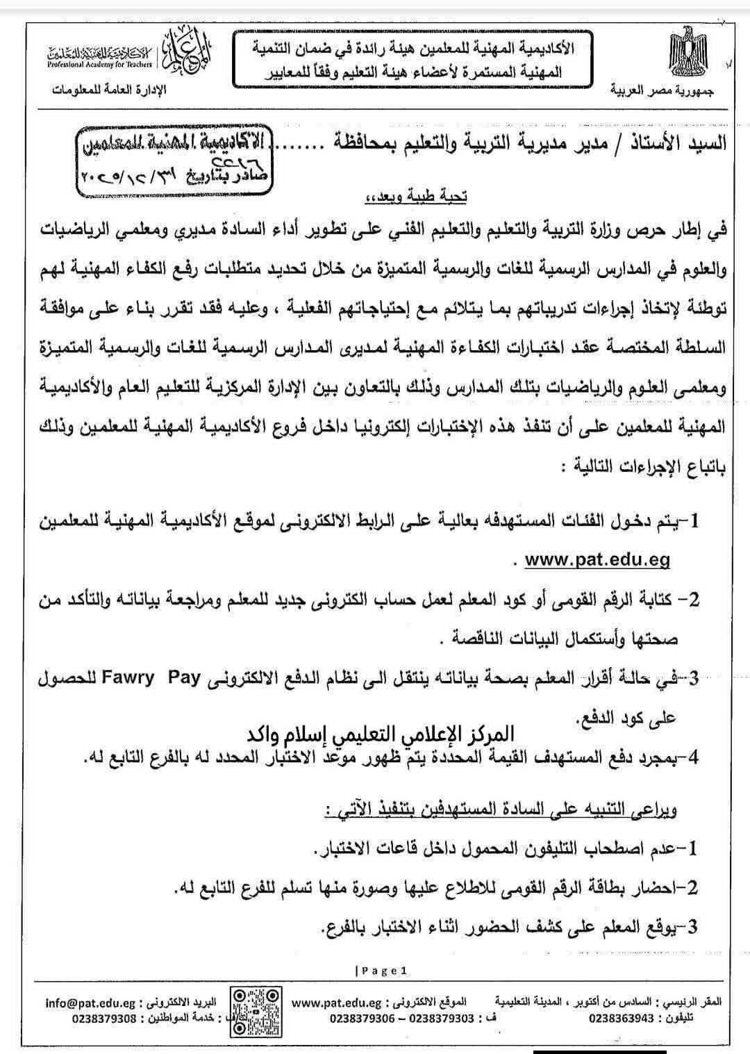 أصدرت الأكاديمية المهنية للمعلمين خطابًا رسميًا إلى المديريات التعليمية بشأن عقد اختبارات الكفاءة المهنية لمديري المدارس الرسمية للغات والمدارس الرسمية المتميزة، بالإضافة إلى معلمي مادتي العلوم والرياضيات، وذلك في إطار خطة وزارة التربية والتعليم والتعليم الفني لتطوير الأداء المهني ورفع كفاءة القيادات والمعلمين.