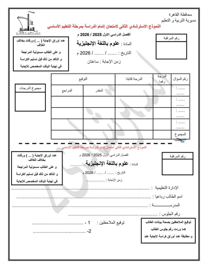 واصلت مديرية التربية والتعليم والتعليم الفني بمحافظة القاهرة، إتاحة النموذج الثانى لبوكليت مادة Science للشهادة الإعدادية للفصل الدراسي الأول ٢٠٢٦/٢٠٢٥.