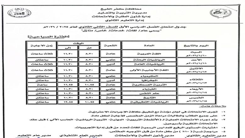 تعرف على مواعيد امتحانات الصف الثاني الثانوي بكفر الشيخ 2026