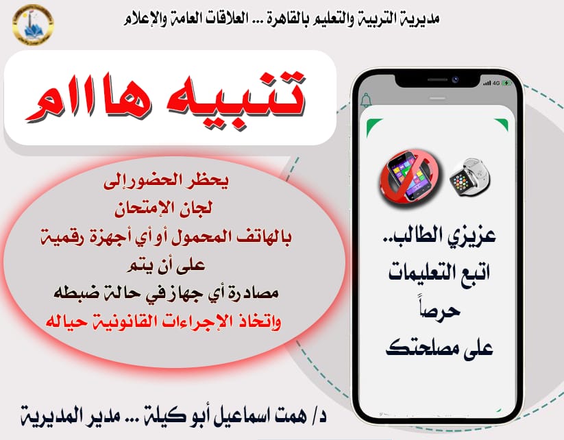 أعلنت مديرية التربية والتعليم والتعليم الفني بمحافظة القاهرة، حظر اصطحاب الهواتف المحمولة نهائيًا داخل لجان امتحانات النقل للطلاب والمعلمين وجميع المشاركين في أعمال الامتحانات، تأكيدًا لقدسية اللجنة وضمانًا لتكافؤ الفرص بين جميع الطلاب.