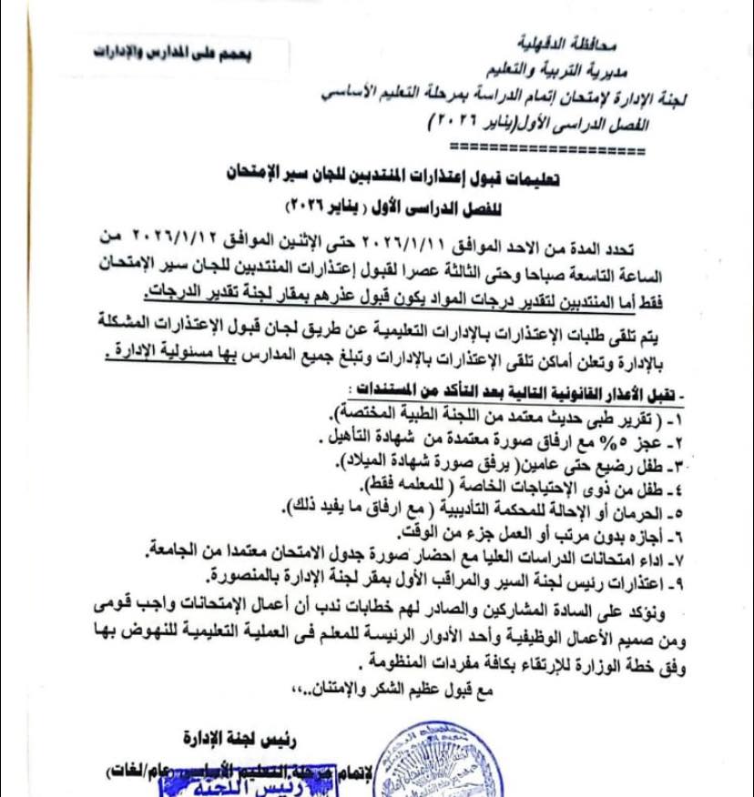 تعليمات قبول اعتذارات المنتدبين للجان امتحانات الشهادة الإعدادية الترم الأول 2026