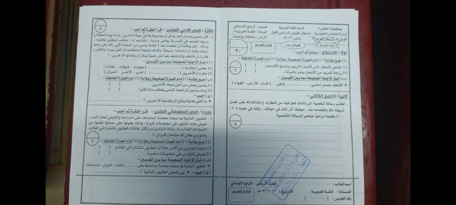امتحان اللغة العربية لتلاميذ الرابع الابتدائي الترم الأول 2026 بالقاهرة
