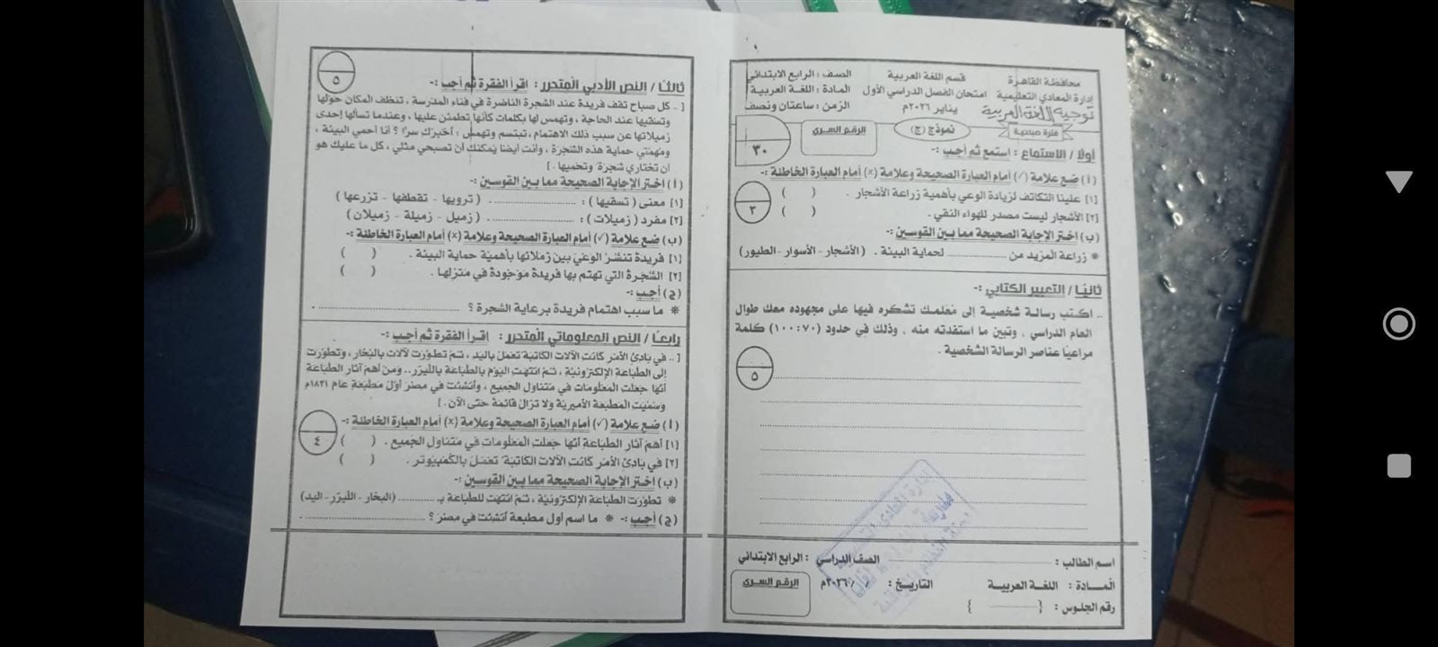 عاجل| شوف حلك.. امتحان اللغة العربية لتلاميذ الرابع الابتدائي الترم الأول 2026 بالقاهرة