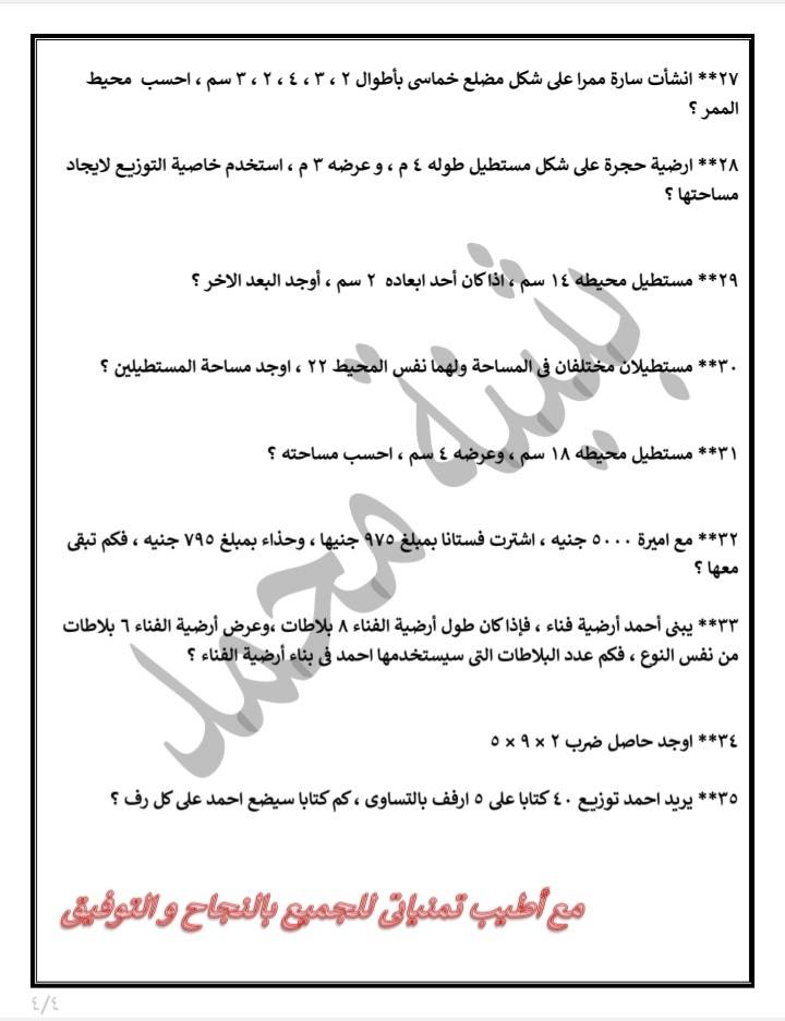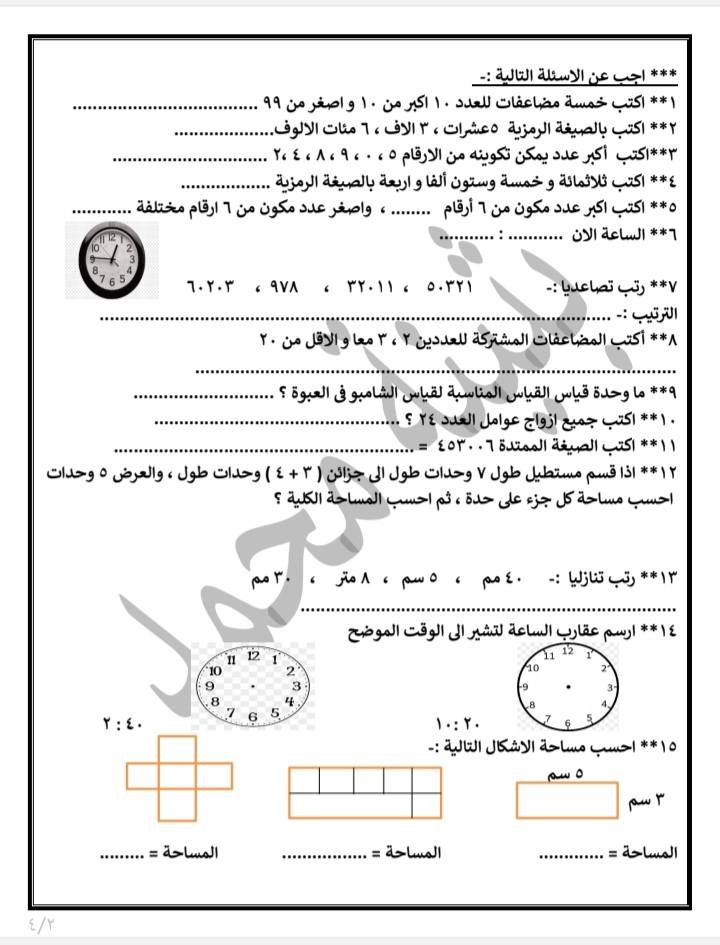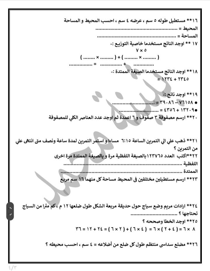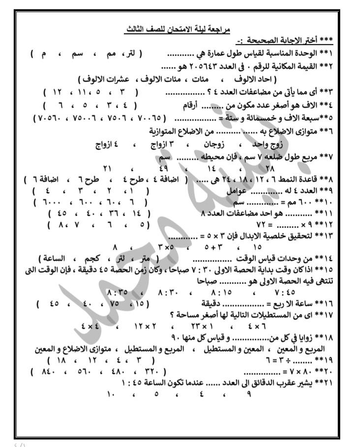 ويمكن الحصول على مراجعة ليلة الامتحان بمادة الرياضيات لطلاب الثالث الابتدائي من خلال مطالعة الصور التالية:
