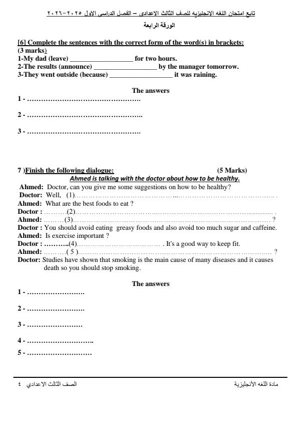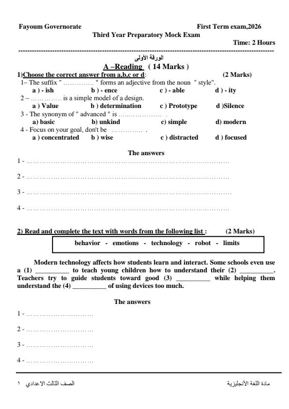 - نموذج امتحان الشهادة الإعدادية بمادة اللغة الإنجليزية الترم الأول 2026