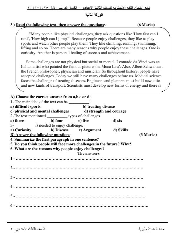 ويمكن الحصول على نموذج امتحان الشهادة الإعدادية بمادة اللغة الإنجليزية الترم الأول 2026 الآتي: