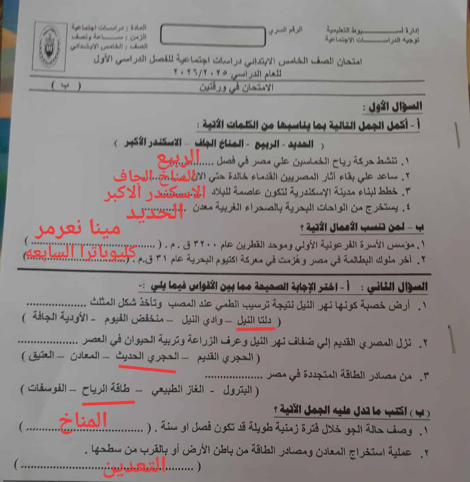إجابة امتحان الدراسات لخامسة ابتدائي الترم الأول 2026 أسيوط