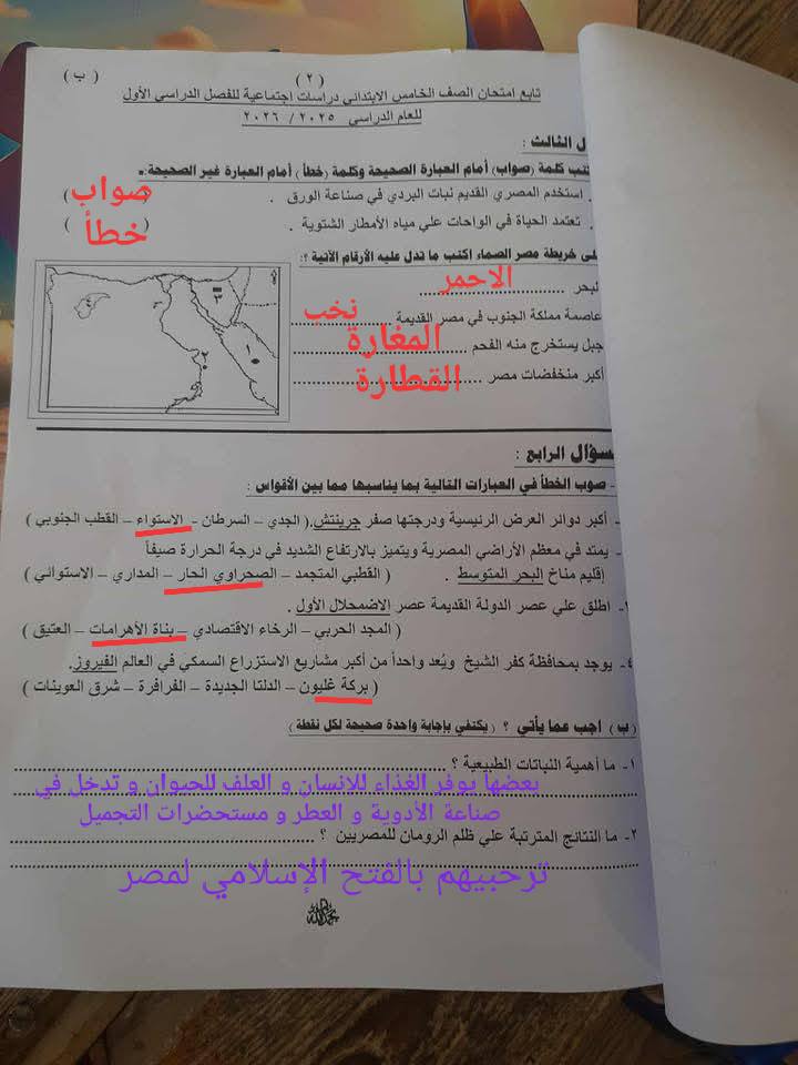 عاجل| إجابة امتحان الدراسات لخامسة ابتدائي الترم الأول 2026 أسيوط