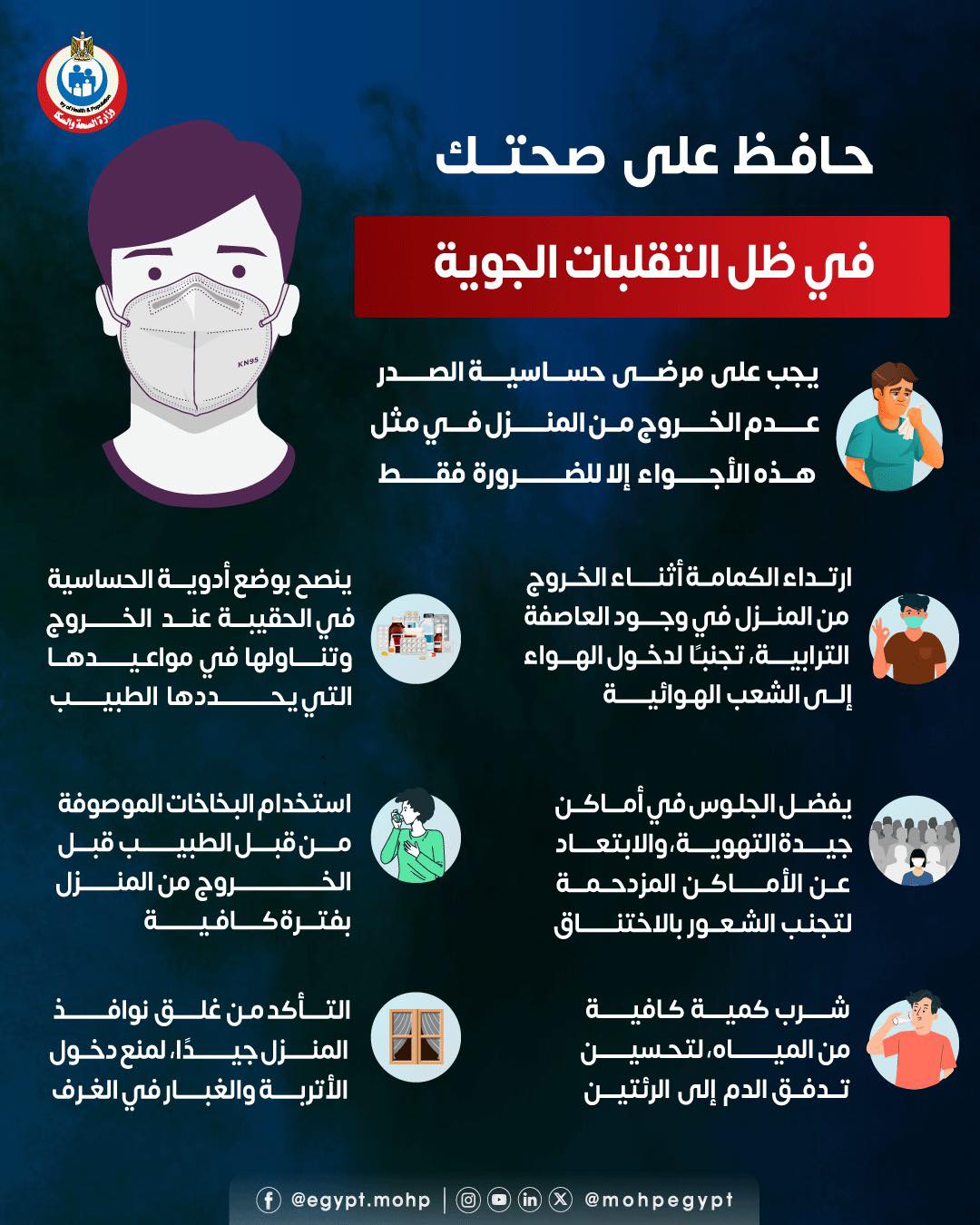 1. يجب على مرضى حساسية الصدر عدم الخروج من المنزل في مثل هذه الأجواء إلا للضرورة فقط