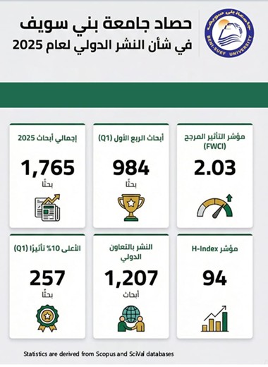 جامعة بني سويف تسجل قفزة نوعية وتنشر 1765 بحث علمي في مجلات دولية خلال عام 2025