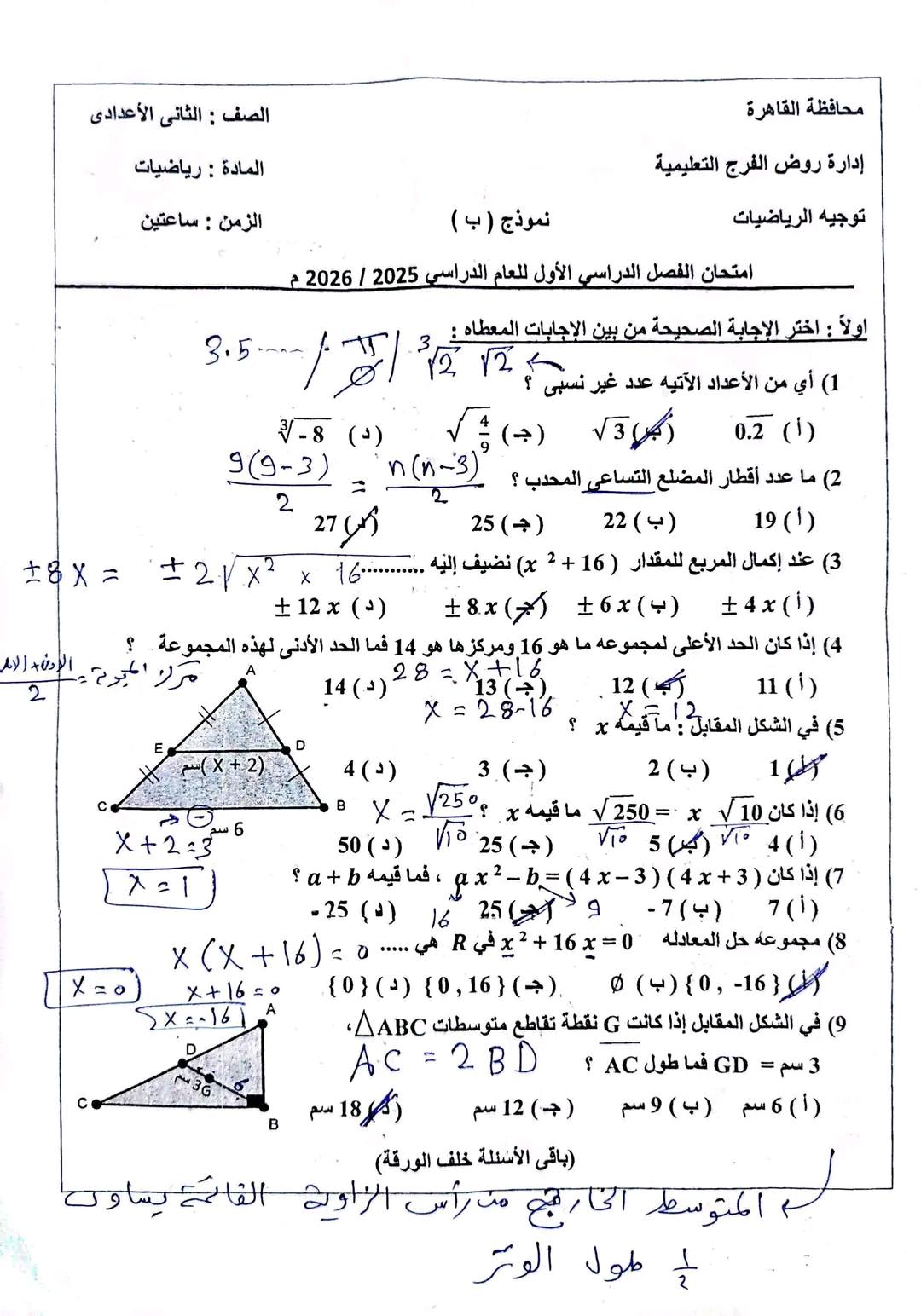 حل امتحان الرياضيات الصف الثاني الإعدادي الترم الأول 2026 محافظة القاهرة