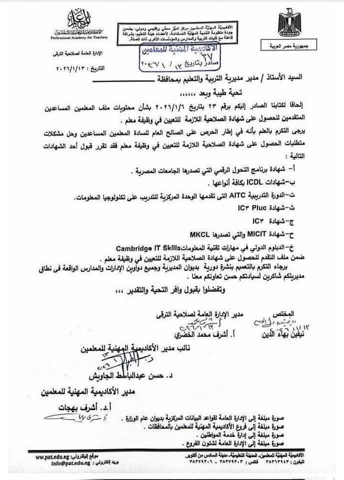 قررت الأكاديمية المهنية للمعلمين، قبول جميع بدائل التحول الرقمي كشرط لتعيين المعلم المساعد، وذلك وفقا الكتاب رقم ٢٣ بتاريخ ۲۰۲٦/١/٦ بشأن محتويات ملف المعلمين المساعدين المتقدمين للحصول على شهادة الصلاحية اللازمة للتعيين في وظيفة معلم.