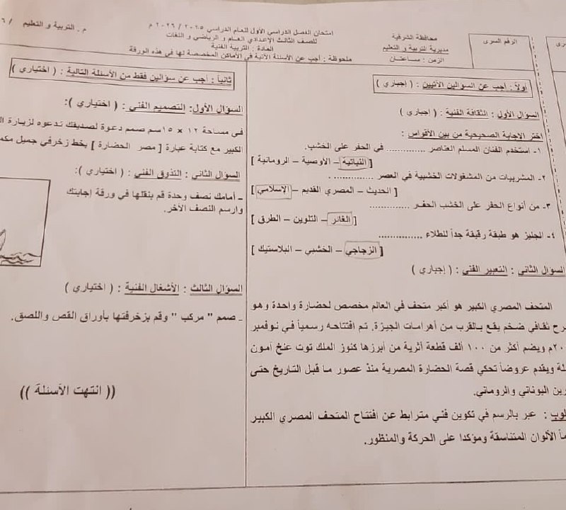 تسريب امتحان التربية الفنية لطلاب الشهادة الإعدادية 2026 الشرقية