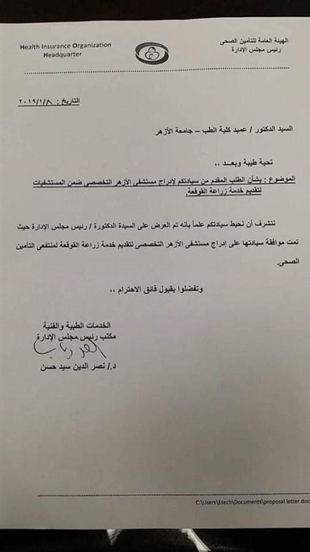 بجامعة الأزهر بمدينة نصر، الشكر للهيئة العامة للتأمين الصحي، على اعتمادها مستشفى
