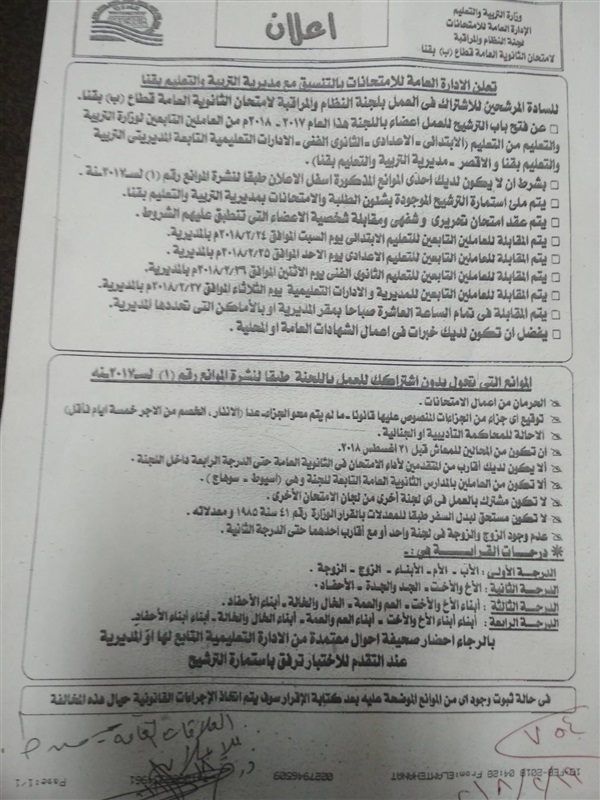أعلنت الادارة العامة للامتحانات في وزارة التربية والتعليم بالتعاون مع مديريات في المحافظات، عن فتح باب العمل للعاملين الراغبين في العمل في لجان النظام والمراقبة التابعة لكنترولات الثانوية العامة.