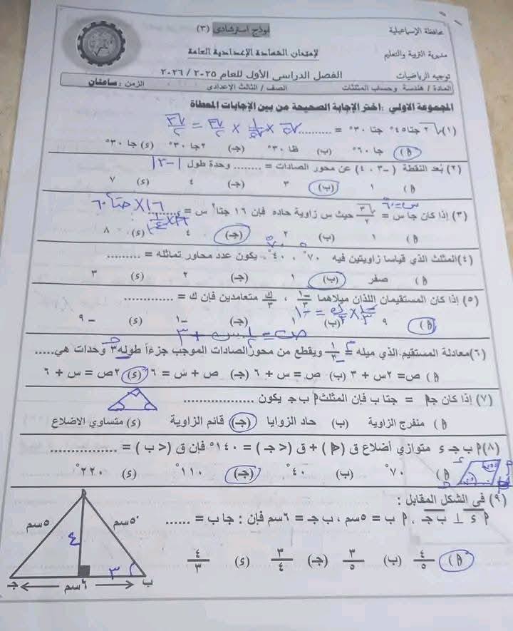 ويمكن الحصول على إجابة نموذج امتحان مادة الهندسة 2026 لطلاب الثالث الإعدادي من خلال مطالعة الصور التالية، والتي تتضمن الأسئلة وإجابتها.