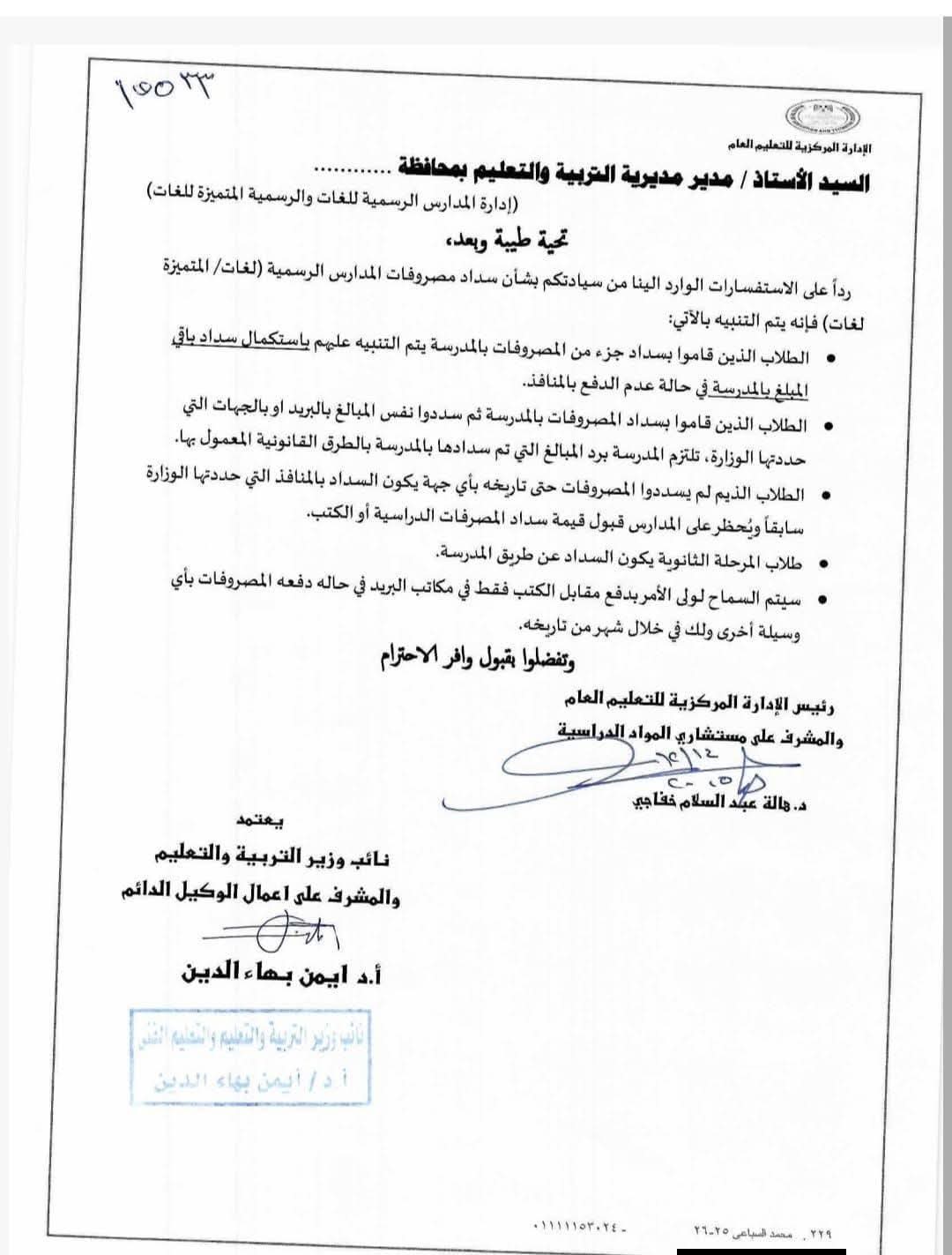 - الطلاب الذين لم يسددوا المصروفات حتى تاريخه بأي جهة يكون السداد بالمنافذ التي حددتها الوزارة سابقًا ويحظر على المدارس قبول قيمة سداد المصرفات الدراسية أو الكتب.