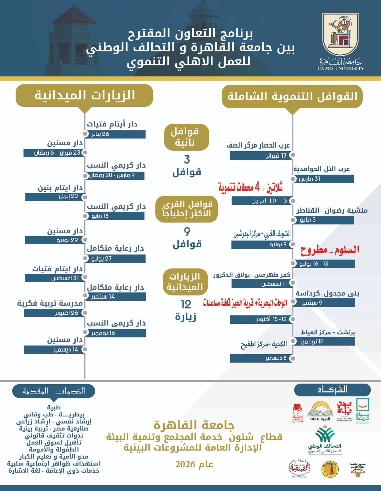 أعلن الدكتور محمد سامي عبدالصادق رئيس جامعة القاهرة، عن إطلاق برنامج القوافل التنموية الشاملة التي يشارك بها قطاع خدمة المجتمع وتنمية البيئة بالجامعة بالتعاون مع التحالف الوطني للعمل الأهلي التنموي، وبمشاركة واسعة من كليات الجامعة المختلفة، وبالتنسيق مع مبادرة بداية جديدة لبناء الإنسان المصري، ومؤسسة حياة كريمة، وبنك الكساء المصري، ومحافظة الجيزة، وصندوق مكافحة وعلاج الإدمان والتعاطي، وشركة بترول خليج السويس، ومؤسسة الصديقية، وذلك في إطار الدور المجتمعي الرائد لجامعة القاهرة في دعم خطط الدولة للتنمية المستدامة.