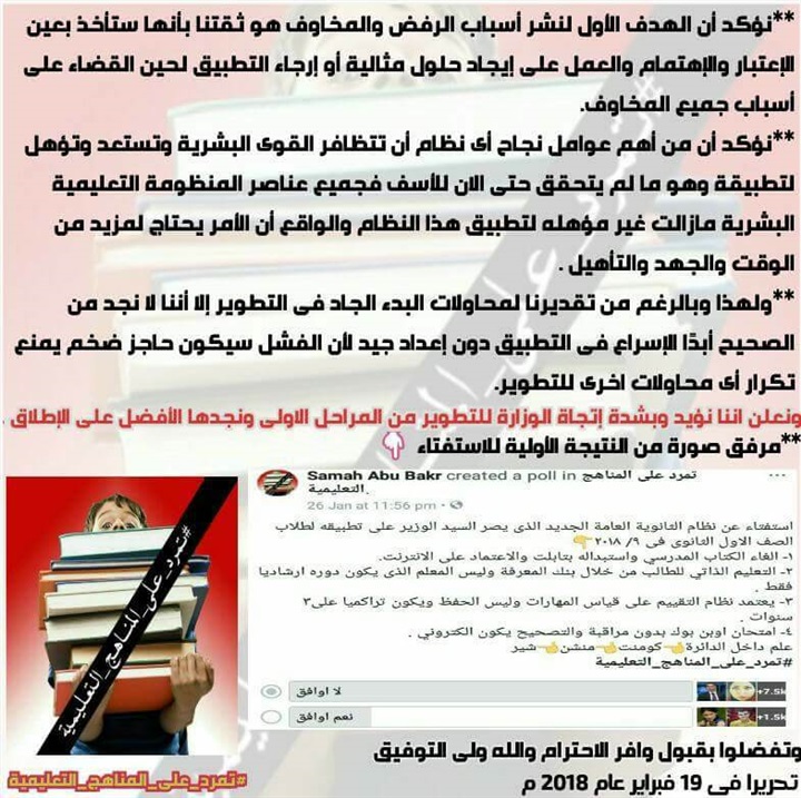 2- نود أن نؤكد اننا لسنا ضد التطوير ابدًا بل نحن أول من طالب به وقد كان من اهم اسباب إنشاء جروب تمرد على المناهج التعليمية، لكننا نرفض مقترحات نؤكد مدى صعوبة أو إستحالة تطبيقها حاليًا من واقع معايشتنا اليومية مع أبنائنا.