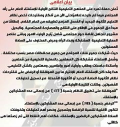 وقال البيان ان الإستفتاء العام للإختيار كان ما بين الموافقة أو الرفض على مُقترحات نظام الثانوية العامة الجديد أو الثانوية المُعدلة مع تسجيل تعليقات المُصَوتين ،وكانت النتيجة الأولية هى :
