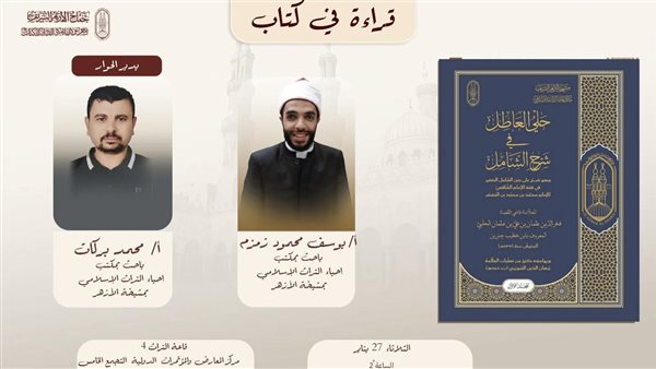 ويشارك في الندوة كلٌّ من الأستاذ يوسف محمود زمزم، والأستاذ محمد بركات، الباحثين بمكتب إحياء التراث الإسلامي بمشيخة الأزهر، حيث يتناولان قراءة تحليلية في كتاب العلامة قاضي القضاة فخر الدين عثمان بن علي بن عثمان الحلبي المعروف بابن خطيب جبرين والمتوفى ٧٣٩هـ، مع تسليط الضوء على قيمته العلمية ومنهجه في شرح الشمائل النبوية، وما يحمله من دلالات تربوية وسلوكية تعزز محبة النبي ﷺ والاقتداء به.