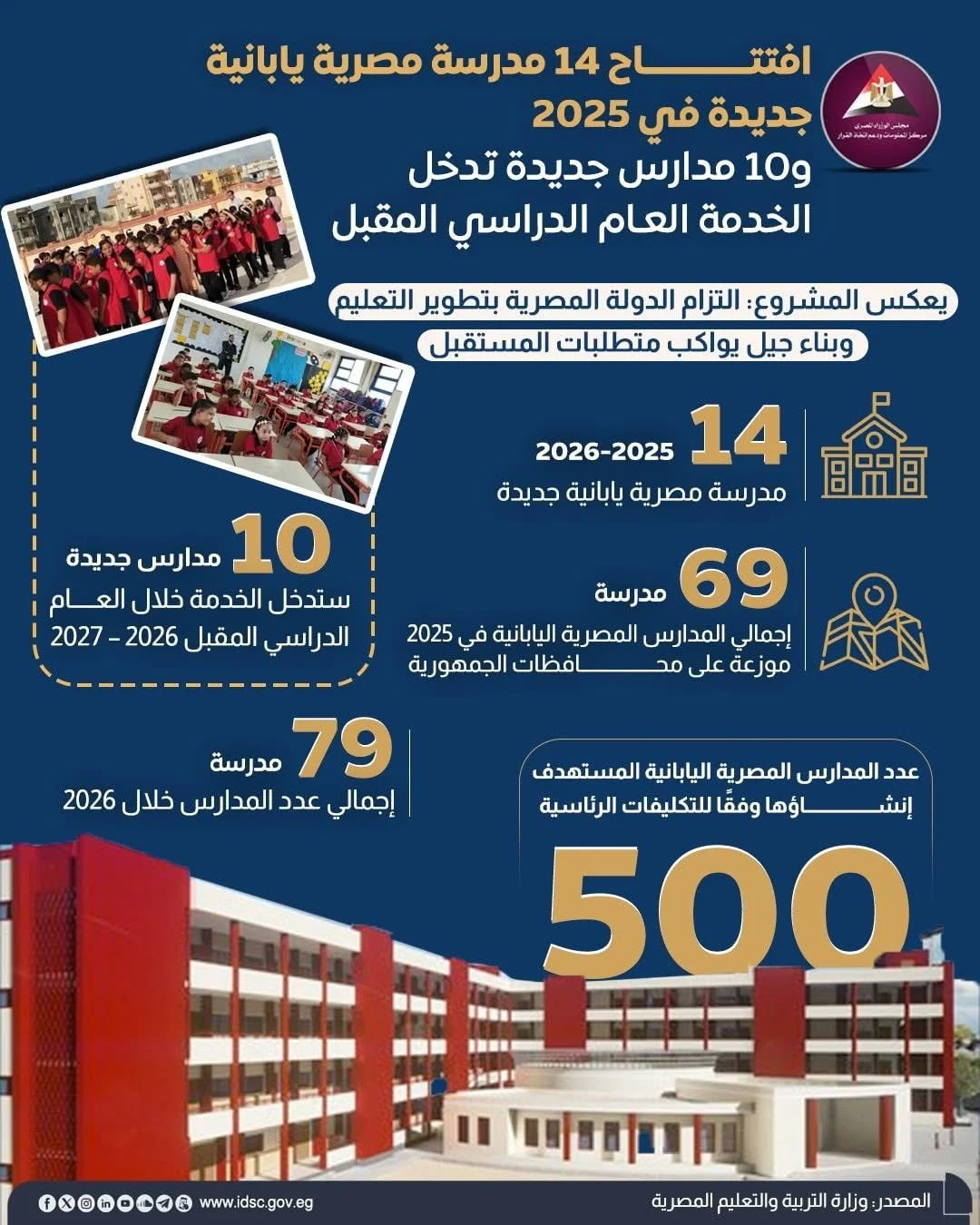 نشر مركز المعلومات ودعم اتخاذ القرار بمجلس الوزراء سلسلة من الإنفوجرافيك عبر منصاته الرقمية، استعرض خلالها جهود الدولة في تطوير منظومة التعليم، وبناء أجيال قادرة على مواكبة متطلبات المستقبل، من خلال تجربة المدارس المصرية اليابانية، باعتبارها أحد النماذج التعليمية الحديثة التي تعتمد فلسفة تعليمية شاملة.