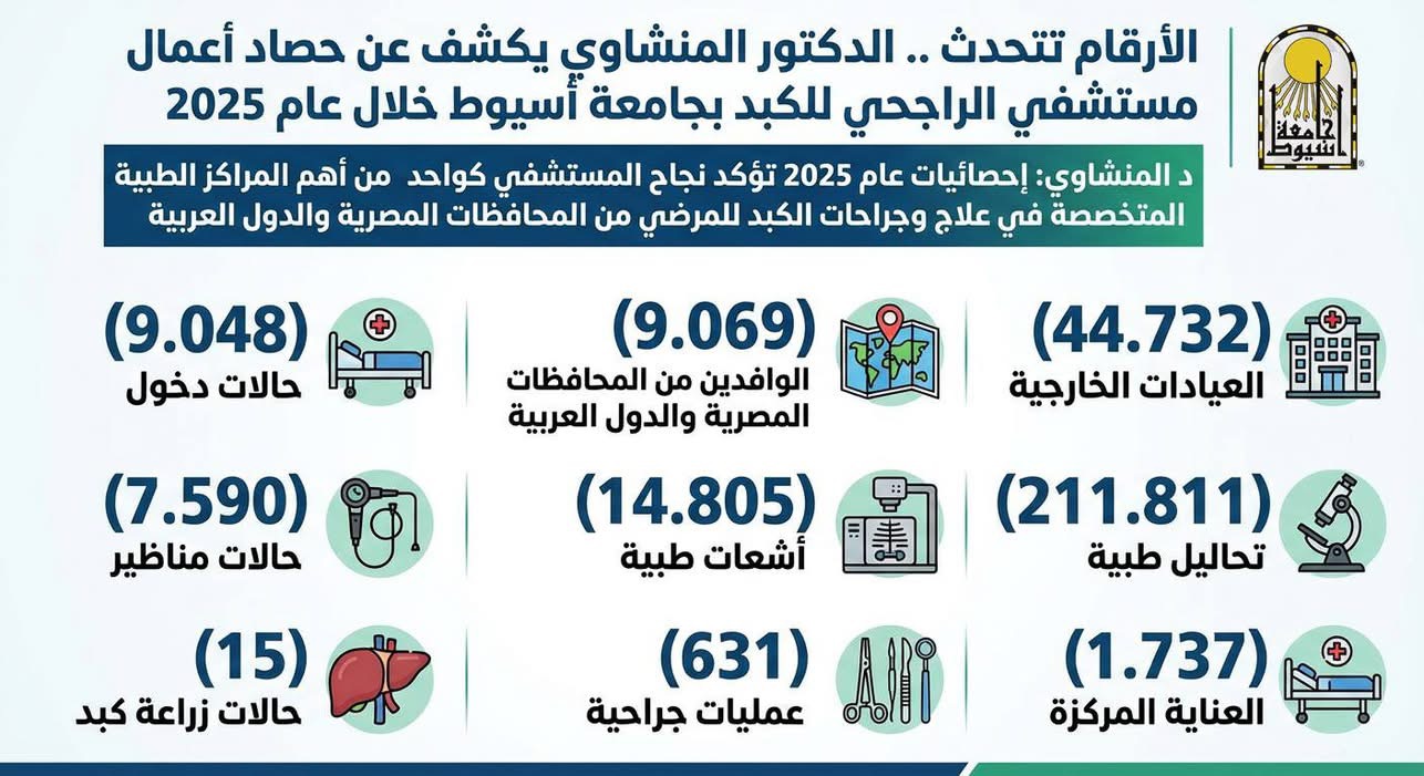 كشف الدكتور أحمد المنشاوي، رئيس جامعة أسيوط، عن حصاد أعمال مستشفى الراجحي للكبد الجامعي خلال عام 2025، والذي يُعد أحد أهم الصروح الطبية المتخصصة في علاج وجراحات الكبد بصعيد مصر، ويستقبل المترددين من مختلف المحافظات المصرية والدول العربية، وذلك تحت إشراف الدكتور علاء عطية، عميد كلية الطب ورئيس مجلس إدارة المستشفيات الجامعية، والدكتور شريف كامل، مدير المستشفى.