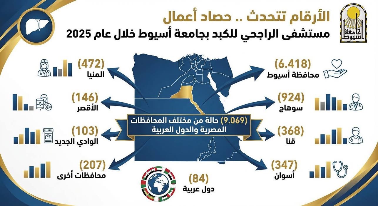 وفي السياق ذاته، أوضح الدكتور شريف كامل، مدير مستشفى الراجحي الجامعي، أن المستشفى استقبل خلال عام 2025 عدد (8.985) مريضًا من مختلف المحافظات المصرية، من بينهم (6.418) مريضًا من محافظة أسيوط، و(924) من محافظة سوهاج، و(472) من المنيا، و(368) من قنا، و(347) من أسوان، و(146) من الأقصر، و(103) من الوادي الجديد، و(207) من محافظات أخرى.