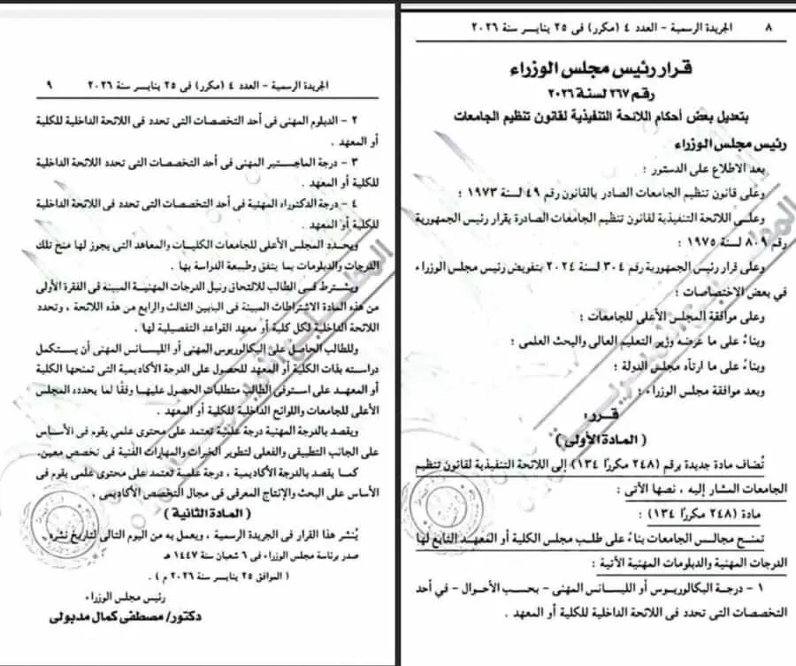 وعقب إقرار هذه التعديلات من المجلس الأعلى للجامعات، تم إرسالها إلى رئيس مجلس الوزراء، الذي أصدر القرار رقم 267 لسنة 2026، والذي نُشر في العدد (4 مكرر 134) من الجريدة الرسمية.