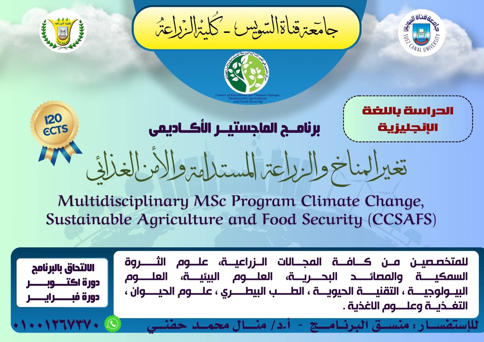 أعلنت كلية الزراعة جامعة قناة السويس عن بدء قبول دفعات جديدة ببرنامج الماجستير الأكاديمي المتكامل والمصنف دوليًا: "تغير المناخ والزراعة المستدامة والأمن الغذائي" (CCSAFS)، وذلك في إطار رؤية وزارة التعليم العالي والبحث العلمي لتطوير البرامج الجامعية واستحداث التخصصات "البينية" لمواجهة التحديات العالمية.