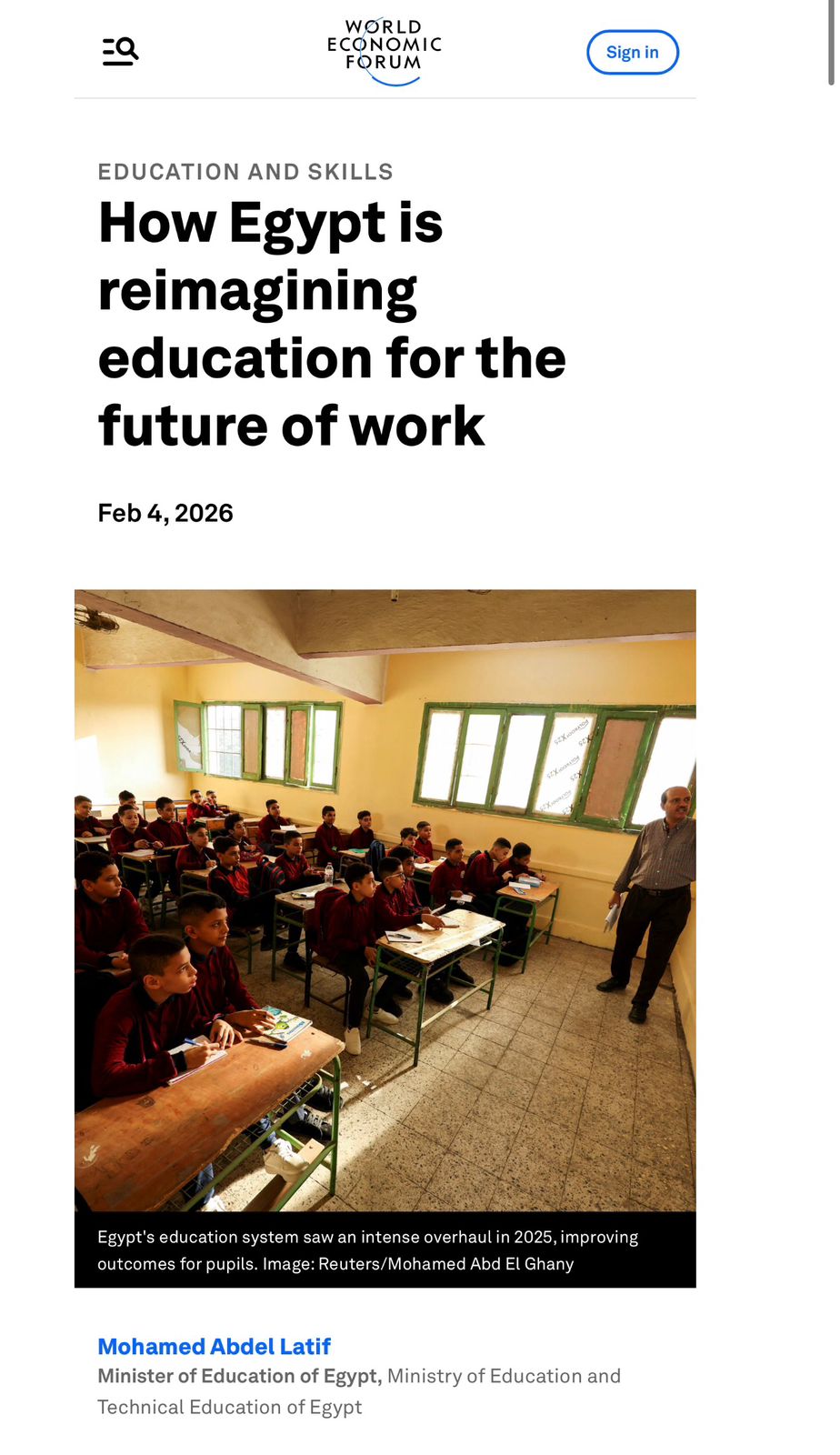 وجاء مقال الوزير، تحت عنوان تحت عنوان "كيف تعيد مصر تصور التعليم من أجل مستقبل العمل"، ليكون بمثابة خطوة أولى من نوعها لوزير تعليم مصري يكتب لمنصة المنتدى متحدثا عن إنجازات مصرية تعليمية، لا أن يدافع عن واقع سلبي ويبرر ويحاول تقديم صورة إيجابية لواقع ملغم بالتحديات، وهو ما يعكس إلى أي درجة صارت مصر تمتلك في آخر عامين، منظومة تعليمية جديرة بالاحترام والتقدير الدولي، بعيدا عن محاولات تشويه الصورة من البعض عن سوء قصد، أو لأغراض مرتبطة بحسابات المصلحة، وكلها أمور تعكس تقديرا من المنتدى الاقتصادي العالمي (World Economic Forum) لجهود إصلاح المنظومة التعليمية في مصر على مدار العامين الماضيين، بعد أن كانت المنصة لا تتطرق عن مصر تعليميا، سوى بإظهار التحديات والمعوقات الموجودة على الأرض، أما اليوم فهي تتحدث عن إنجازات ملهمة لغيرها من الدول المحيطة.