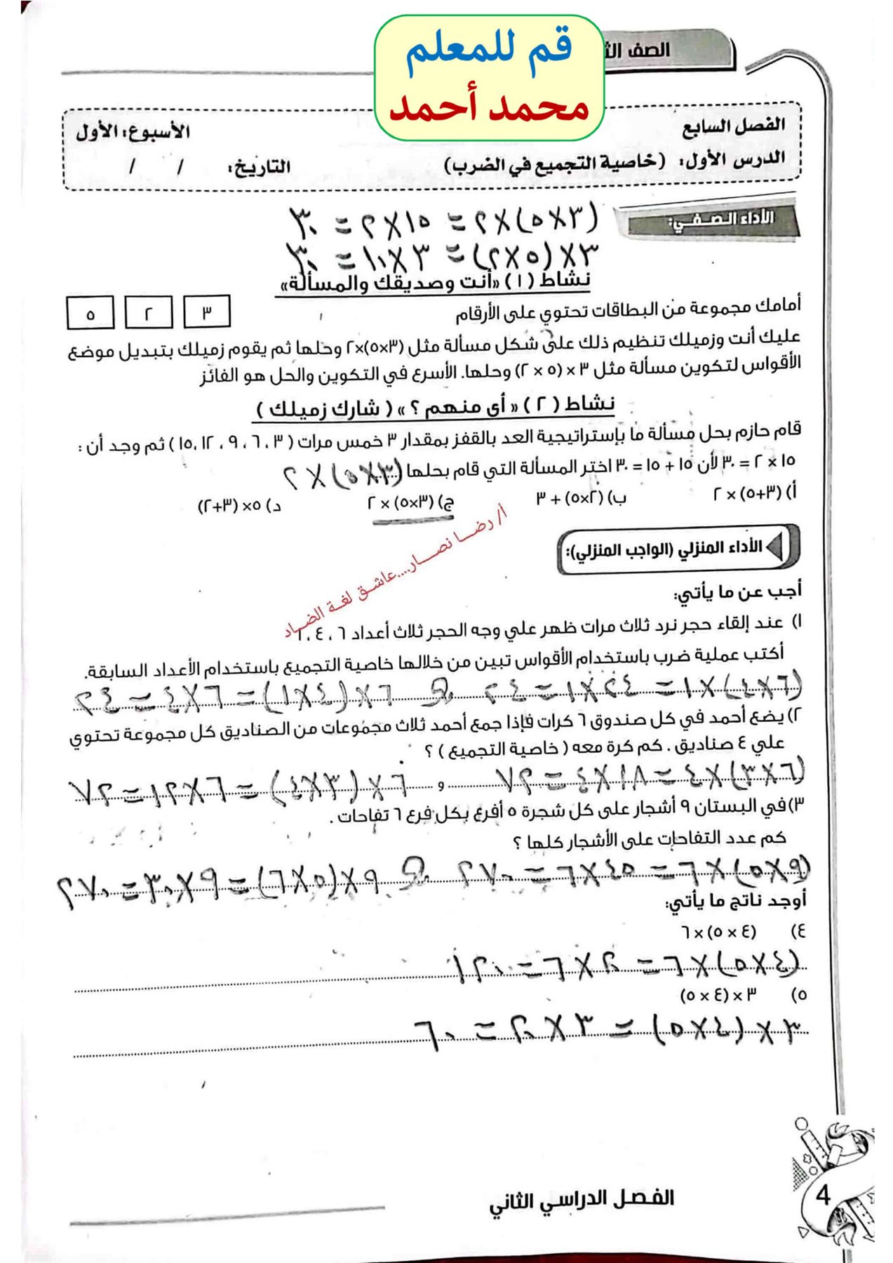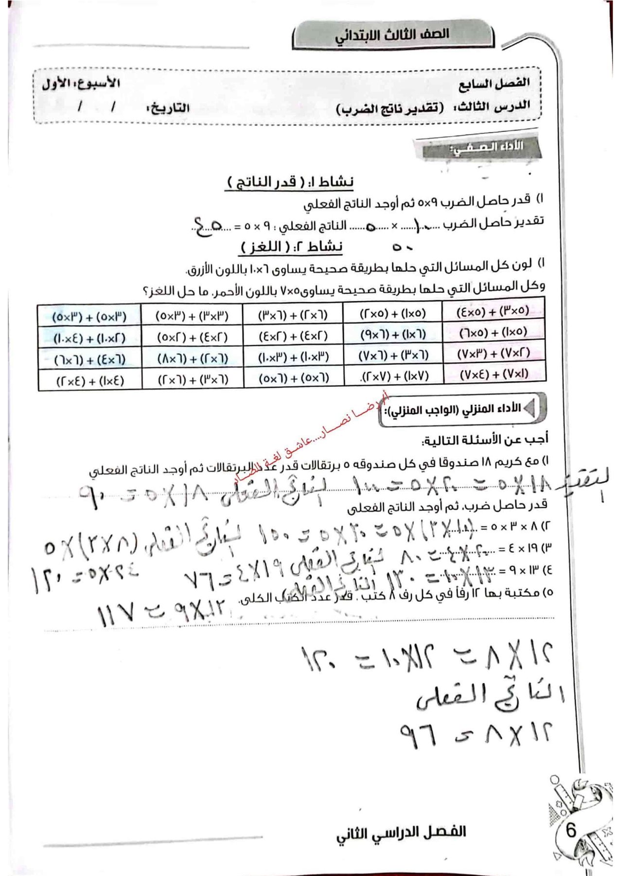 - حل تقييم الأسبوع الأول مادة الرياضيات لثالثة ابتدائي الترم الثاني 2026