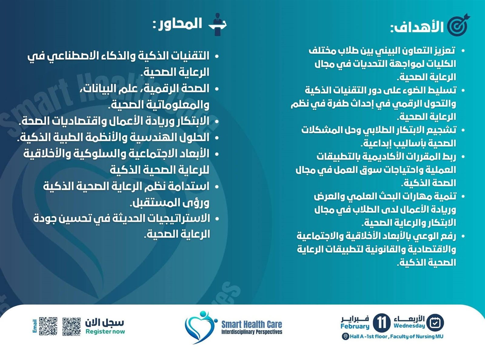 كما يتناول المؤتمر عددًا من المحاور العلمية المهمة، تشمل التقنيات الذكية والذكاء الاصطناعي في الرعاية الصحية، والصحة الرقمية وعلم البيانات والمعلوماتية الصحية، والابتكار وريادة الأعمال واقتصاديات الصحة، والحلول الهندسية والأنظمة الطبية الذكية، فضلًا عن الأبعاد الاجتماعية والسلوكية والأخلاقية للرعاية الصحية الذكية، واستدامة نظم الرعاية الصحية الذكية ورؤى المستقبل، والاستراتيجيات الحديثة في تحسين جودة الرعاية الصحية.