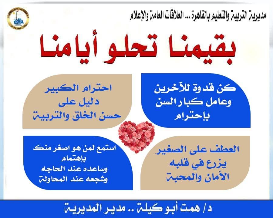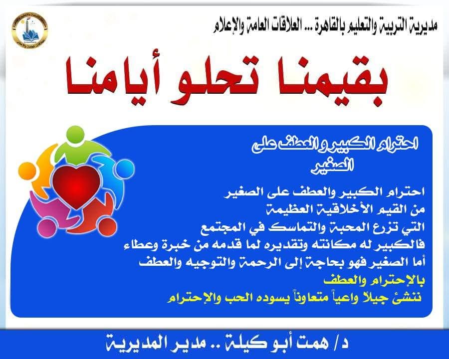 وأكدت مديرية التربية والتعليم بالقاهرة أن مبادرة «بقيمنا تحلو أيامنا» تهدف إلى إعداد جيل واعٍ قادر على التفاعل الإيجابي مع المجتمع، قائم على الأخلاق والانتماء وحب الوطن، بما يسهم في بناء مستقبل أفضل لأبنائنا الطلاب.