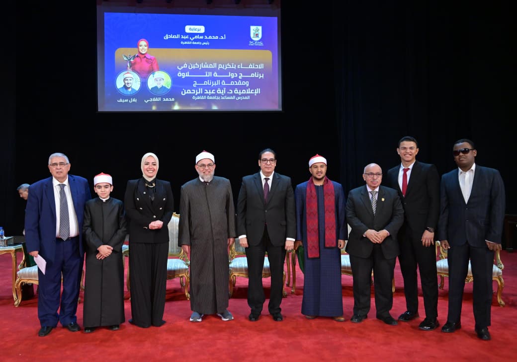 استأنفت جامعة القاهرة، برعاية الدكتور محمد سامي عبد الصادق رئيس الجامعة، فعاليات الموسم الثقافي مع بداية الفصل الدراسى الثانى للعام الجامعي 2025-2026 حيث شهدت قاعة الاحتفالات الكبري بالجامعة لقاء مفتوحا واحتفالية لتكريم المشاركين ببرنامج " دولة التلاوة" وهم: الإعلامية د.آية عبد الرحمن المدرس المساعد بكلية التربية النوعية بجامعة القاهرة، وعضو مجلس النواب، ومحمد القلاجي، وبلال سيف.