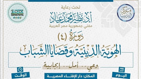 تحت رعاية الدكتور نظير محمد عيَّاد، مفتي الجمهورية ورئيس الأمانة العامة لدُور وهيئات الإفتاء في العالم، تُنظِّم دار الإفتاء المصرية دورة تدريبية تفاعلية بعنوان «الهُوية الدينية وقضايا الشباب»، يوم الإثنين الموافق 16 فبراير 2026م، من الساعة الثالثة عصرًا حتى السابعة مساءً، بمقر دار الإفتاء بالقاهرة، في إطار جهودها المستمرة لدعم الشباب وتعزيز وعيهم الديني والفكري لمواجهة التحديات المعاصرة.