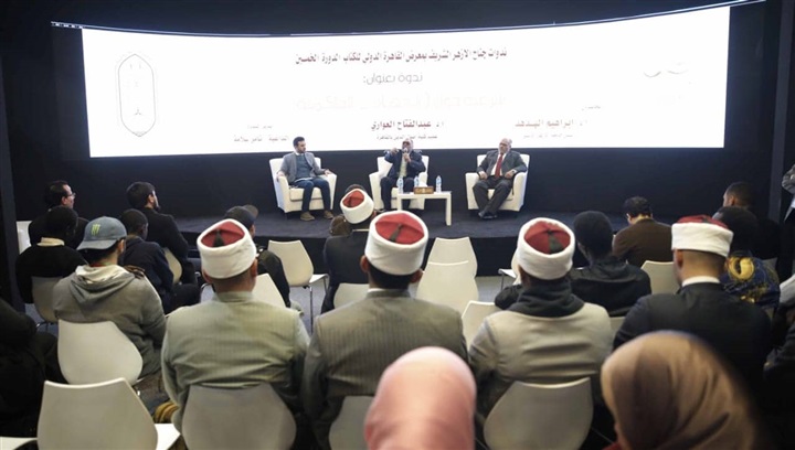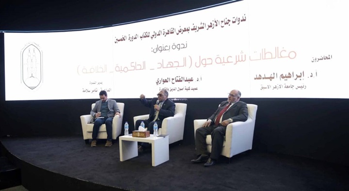 عقد جناح الأزهر الشريف في معرِض القاهرة الدولي للكتاب، خلال دورته 50، بمقر مركز مصر للمعارض الدولية بالتجمع الخامس، ندوة تحت عنوان مغالطات شرعية حول"الجهاد - الحاكمية - الخلافة"، حاضر فيها الدكتور إبراهيم الهدهد رئيس جامعة الأزهر الأسبق، والدكتور عبدالفتاح العواري عميد كلية أصول الدين بالقاهرة.