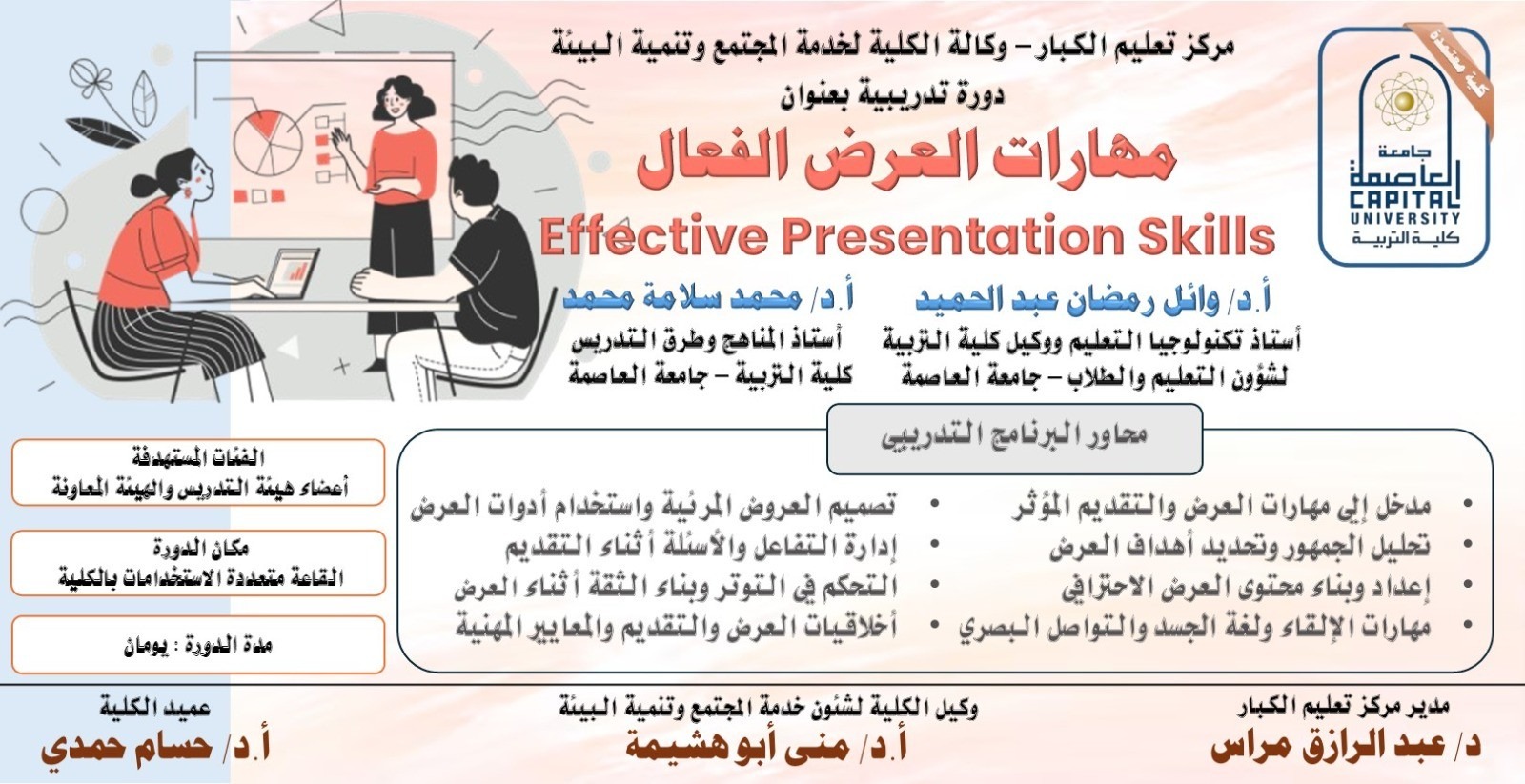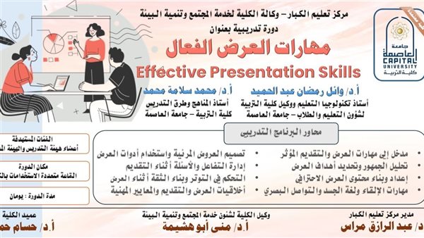 أعلنت جامعة العاصمة عن تنظيم برنامج تدريبي متخصص بعنوان مهارات العرض الفعال Effective Presentation Skills، تحت رعاية الدكتور السيد قنديل رئيس جامعة العاصمة، الدكتور وليد السروجي نائب رئيس جامعة العاصمة لشئون خدمة المجتمع وتنمية البيئة، الدكتور حسام حمدي عميد كلية التربية جامعة العاصمة، والدكتورة منى أبو هشيمة وكيل الكلية لشئون خدمة المجتمع وتنمية البيئة.