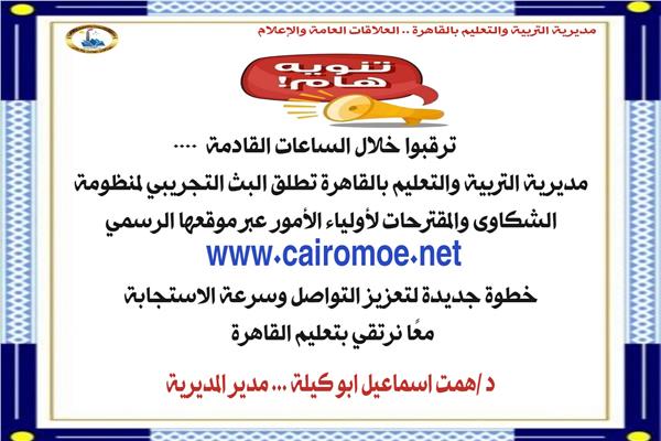 أعلنت مديرية التربية والتعليم بـالقاهرة عن إطلاق البث التجريبي لمنظومة الشكاوى والمقترحات عبر الموقع الإلكتروني الرسمي للمديرية خلال الساعات المقبلة، في خطوة جديدة لتعزيز قنوات التواصل الفعّال مع أولياء الأمور.