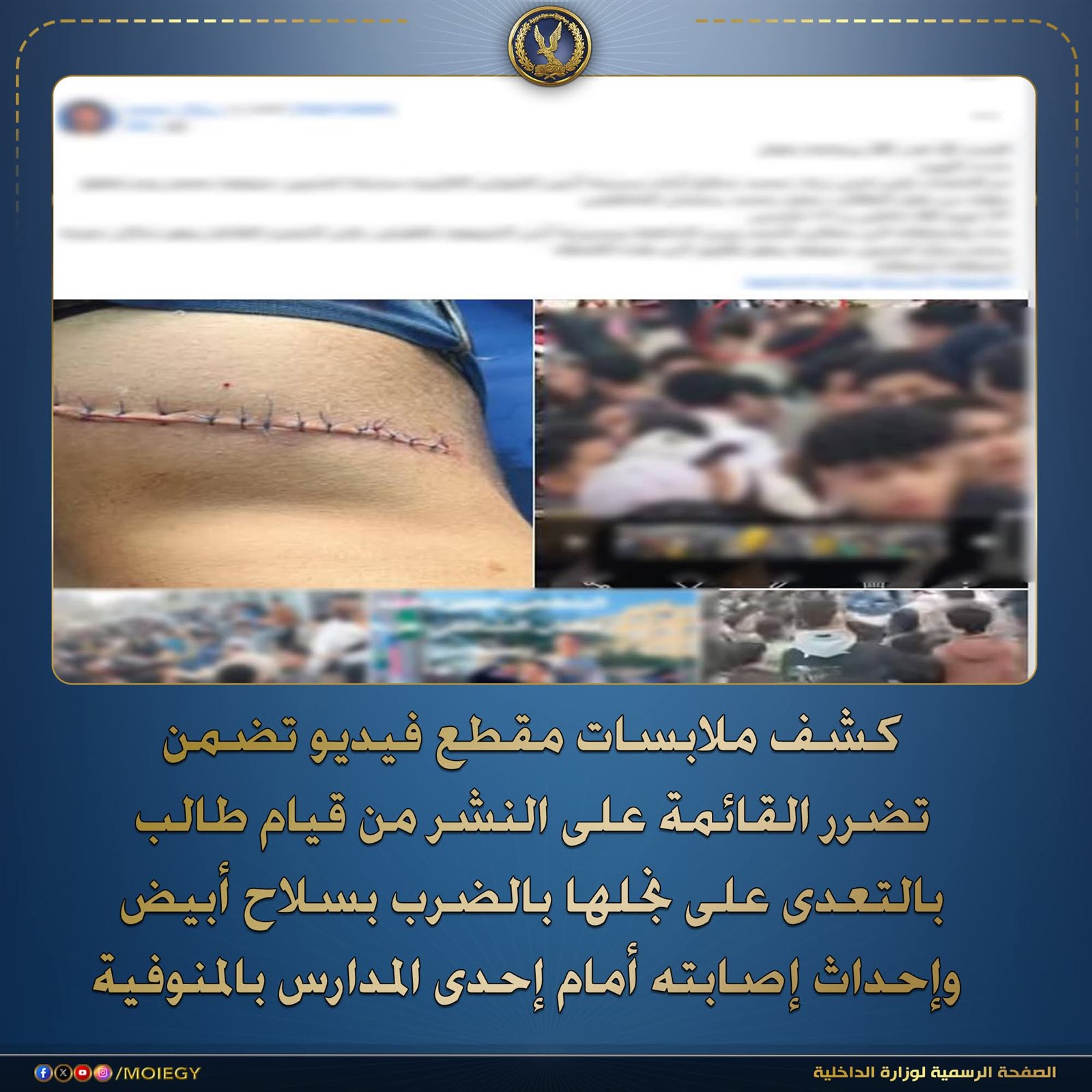 كشفت وزارة الداخلية  ملابسات مقطع فيديو تم تداوله بمواقع التواصل الإجتماعى تضمن تضرر القائمة على النشر من قيام طالب بالتعدى على نجلها بالضرب بسلاح أبيض وإحداث إصابته أمام إحدى المدارس بالمنوفية.