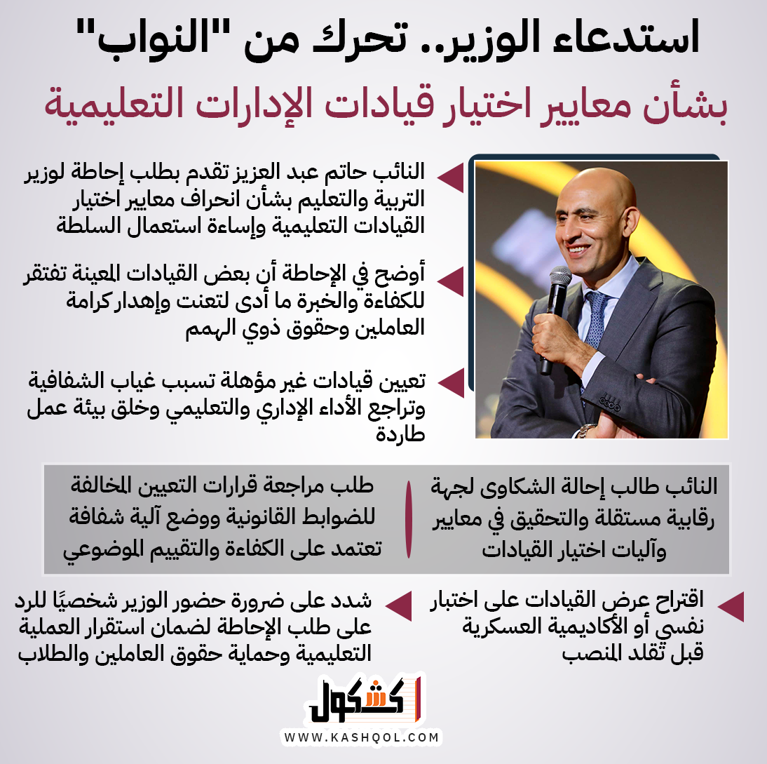 - النائب حاتم عبد العزيز تقدم بطلب إحاطة لوزير التربية والتعليم بشأن انحراف معايير اختيار القيادات التعليمية وإساءة استعمال السلطة