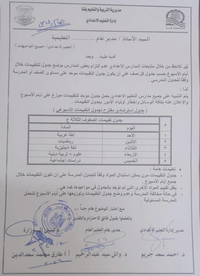 وأشارت إلى أن تقييمات المواد التي لم ترد بالجدول في مواعيدها كما هي، مؤكدة أنه في حالة مخالفة المدرسة وعدم وضع جدول التقييمات وتوزيعها على أيام الأسبوع تتحمل المدرسة المسئولية.