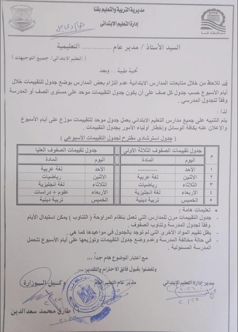 جداول التقييمات الأسبوعية لطلاب صفوف النقل الترم الثاني 2026 بمحافظة قنا