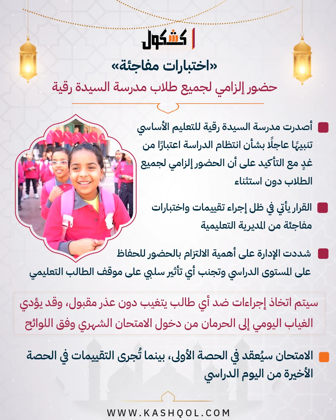 - أصدرت مدرسة السيدة رقية للتعليم الأساسي تنبيهًا عاجلًا بشأن انتظام الدراسة اعتبارًا من غدٍ مع التأكيد على أن الحضور إلزامي لجميع الطلاب دون استثناء