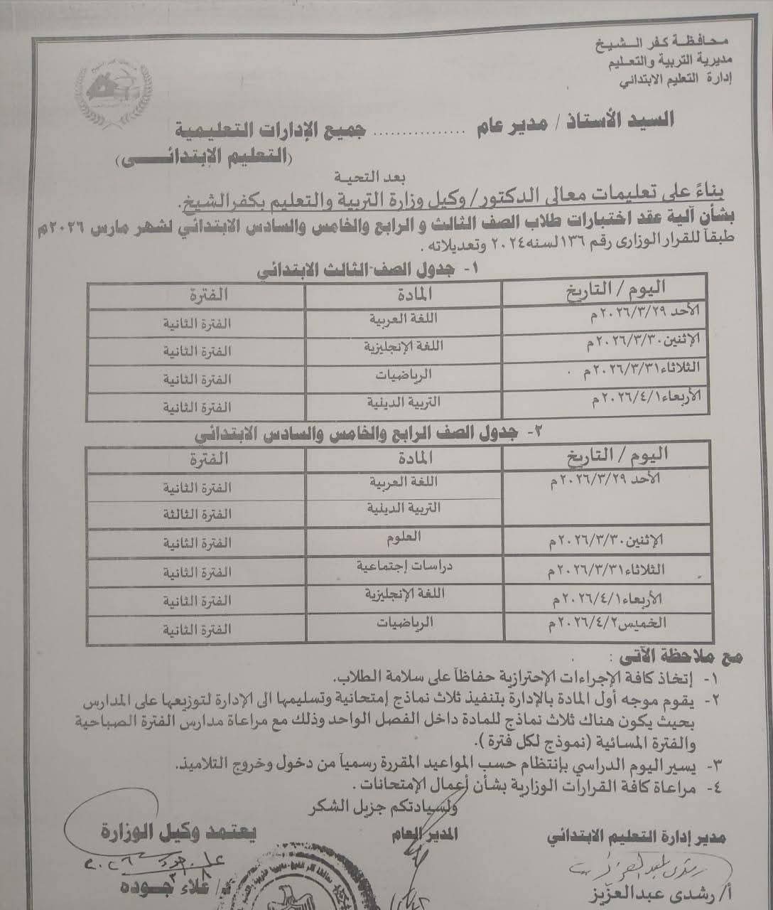 جداول امتحانات شهر مارس 2026 لصفوف النقل محافظة كفر الشيخ