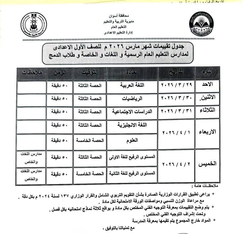 كما يمكن الحصول على جدول امتحانات شهر مارس 2026 لطلاب الأول والثاني الإعدادي من خلال مطالعة الصور التالية: