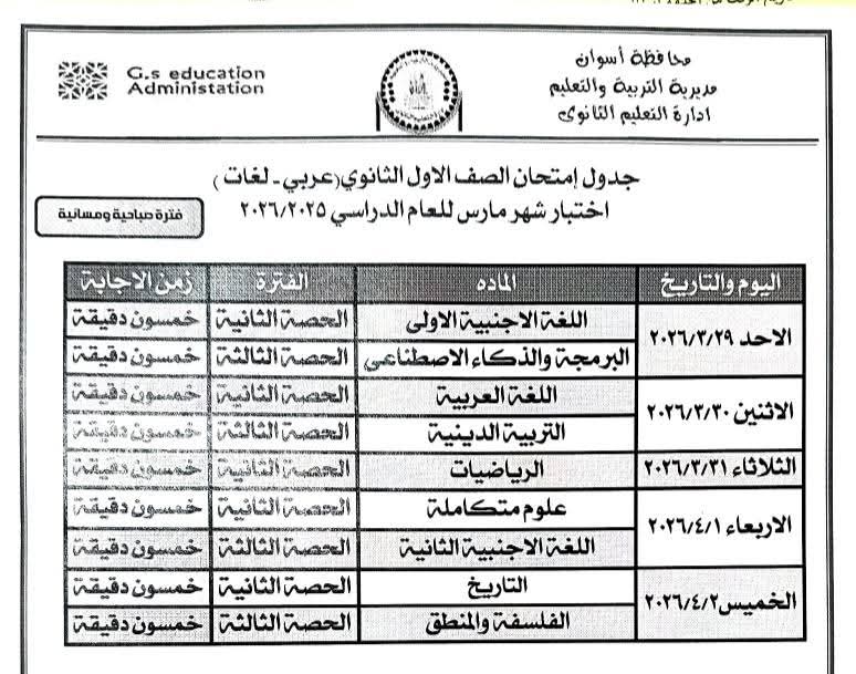 أعلنت مديرية التربية والتعليم والتعليم الفني بمحافظة أسوان، جداول امتحانات شهر مارس 2026 لجميع الصفوف، بعد قرار وزارة التربية والتعليم والتعليم الفني بتأجيل موعد بدء الامتحانات ليوم 29 مارس الجاري.