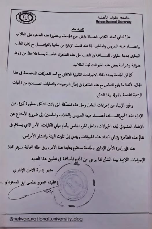طالبت الجامعة الجميع بـ الامتناع عن الإطعام العشوائي للكلاب داخل الحرم الجامعي وأمام مباني الكليات، لما يسببه من زيادة أعداد الكلاب الضالة، تلوث البيئة الجامعية، واحتمالية انتشار الأمراض.