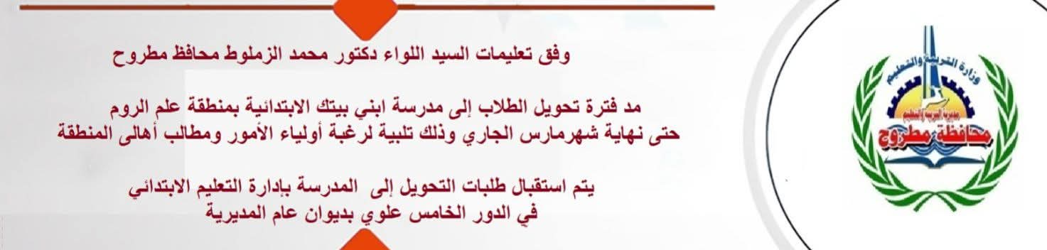 قررت مديرية التربية والتعليم والتعليم الفني بمحافظة مطروح،  مد فترة تحويل الطلاب إلى مدرسة ابني بيتك الابتدائية بمنطقة علم الروم حتى نهاية شهر مارس الجاري.